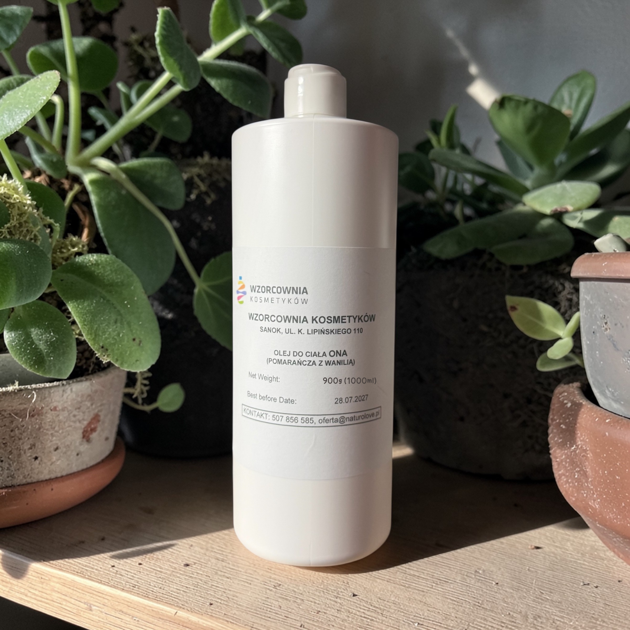 Olej do masażu ONA to połączenie dwóch olei bazowych - oleju ze słodkich migdałów z olejem z pestek granatu. Olejek do masażu pielęgnuje naszą skórę i zostawia ją aksamitnie gładką. Olej ze słodkich migdałów jest olejem idealnie sprawdzającym się przy masażu ciała, daje odpowiednie nawilżenie dzięki czemu jest bardzo wydajny. Olej z pestek granatu odżywia i regeneruję skórę. Połączenie tych dwóch olei bazowych daje odpowiednie nawilżenie oraz "poślizg" co pozwala na płynne i relaksujące ruchy bez tarcia. Nasz olej do masażu jest idealny do zabiegów relaksacyjnych oraz pielęgnacyjnych. Zniewalające połączenie olejków eterycznych, wanilii z pomarańczą pozwoli nam się odpowiednio odprężyć, nadając wyjątkowy nastrój w naszym gabinecie.